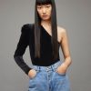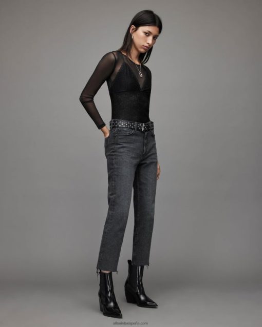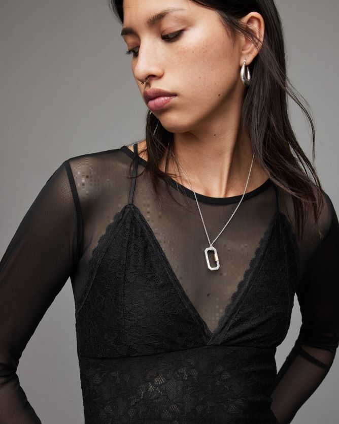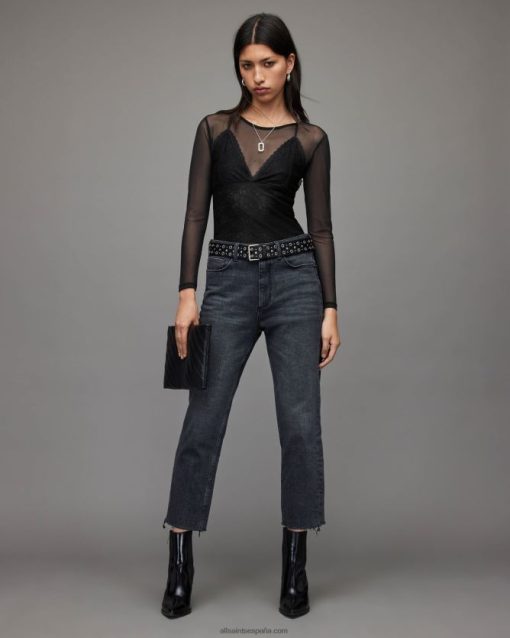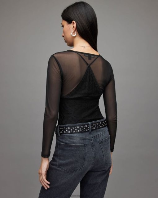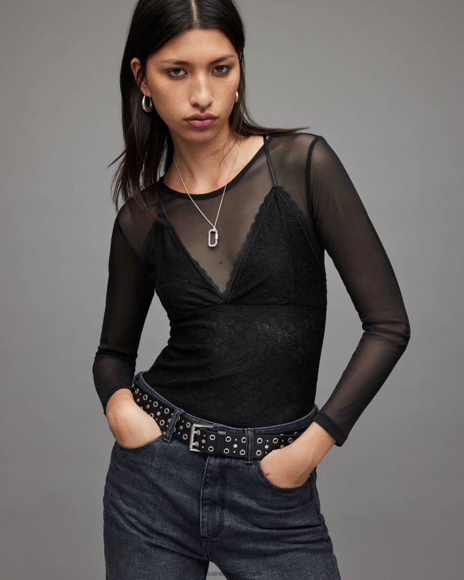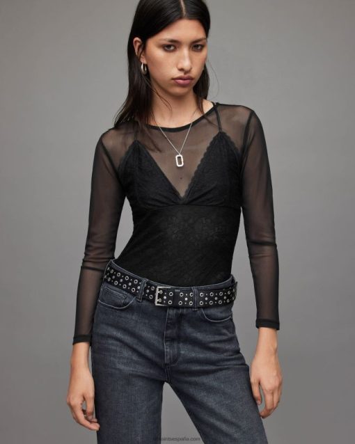 la malla se encuentra con el encaje. el mono de nyla. la capa de malla es de manga larga, con una silueta de cuello en V de encaje en la parte superior. está en capas para que no tengas que hacerlo. combínalo con jeans y tacones. cena de noche de cita este es el look.