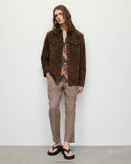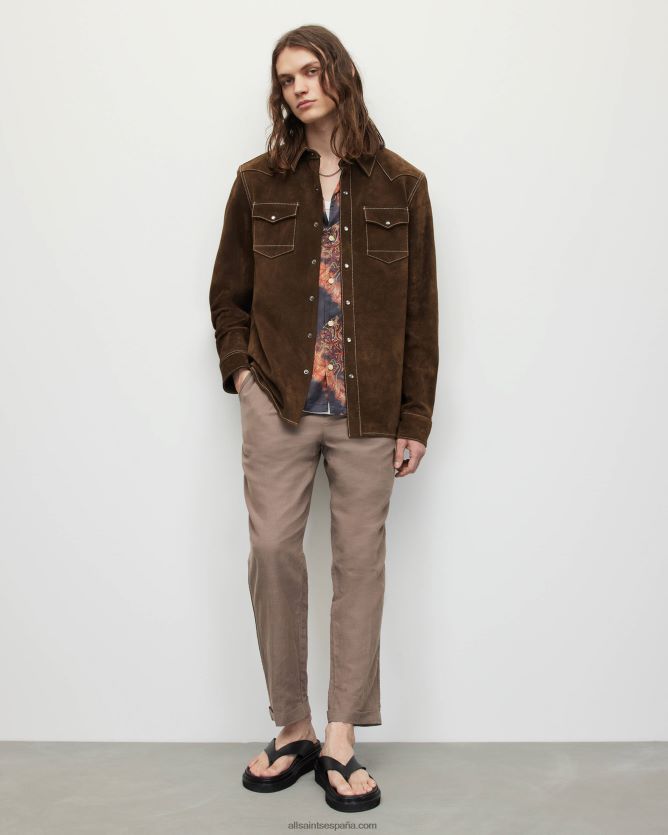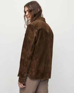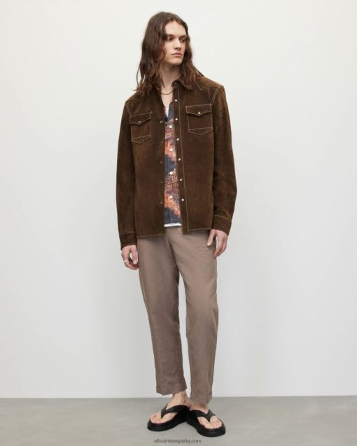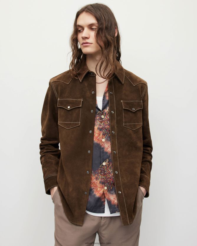 atraviesa las puertas del salón en esto. la camisa de crucero tiene un toque occidental moderno. hecho de gamuza, está tratado para un look lavado vintage. las costuras blancas en contraste resaltan los bolsillos clásicos y los detalles.