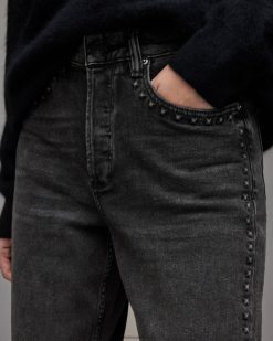 momentos tachonados. los jeans averi han recibido una dura actualización. en forma de una silueta de novio de talle alto con dobladillos desgastados. métete una camiseta y listo.