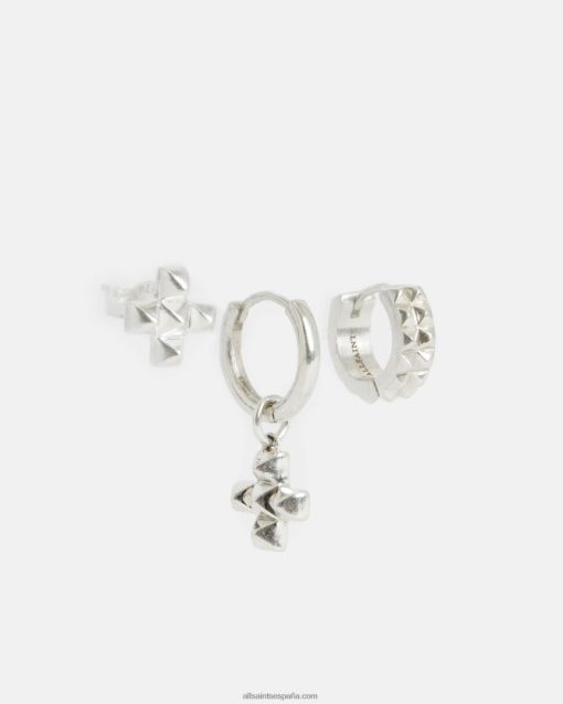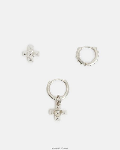 Momentos cruzados, vienen en tres. los pendientes nova son un estilo llamativo: un aro con tachuelas de pirámide, un aro con un dije de cruz y un tachuela de cruz. todo elaborado en plata de ley, mezcle y combine para el uso diario.