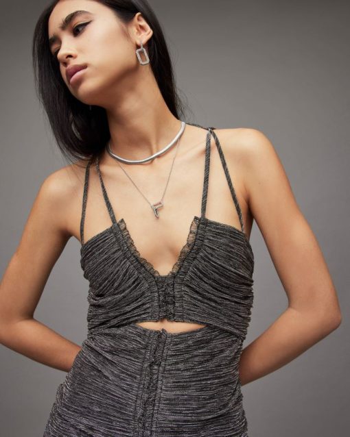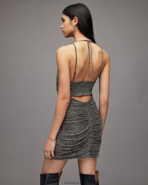 córtalo con el vestido dani. esta silueta de minilargo está confeccionada con tela metalizada plisada para un ajuste favorecedor. Llama la atención esta temporada de fiestas.