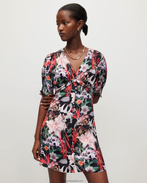 este es el vestido de demi leondra. la tela fluida ofrece un escote en V y una silueta de longitud corta. el fruncido y los detalles de volantes suaves añaden un toque femenino.