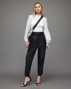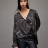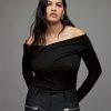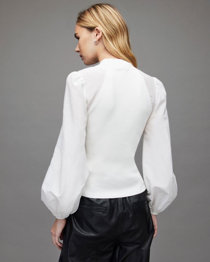 la blusa cleo tiene que ver con las mangas llamativas. de gran tamaño con forma de globo, están confeccionados con un tejido de mezcla de seda y lino. el cuerpo tiene una textura de punto acanalado y un cuello alzado ajustado. Combínalo con tus jeans favoritos: ropa de fin de semana, ordenada.