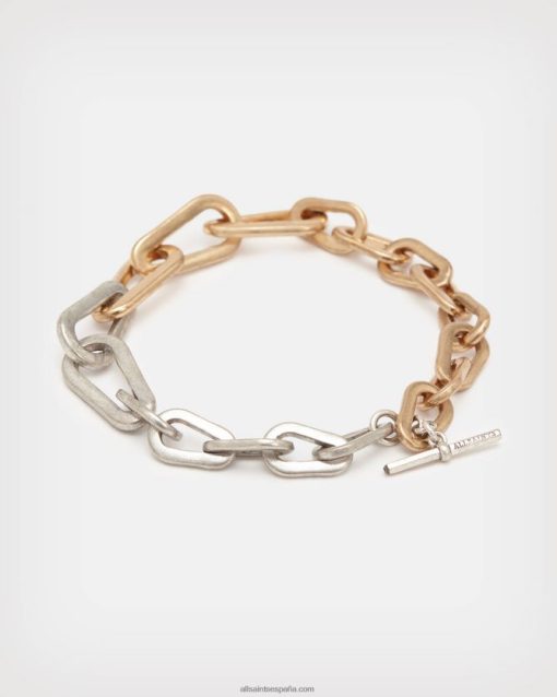 añade contraste a tu colección de joyas con la pulsera carrie. eslabones gruesos plateados y dorados, uno al lado del otro.
