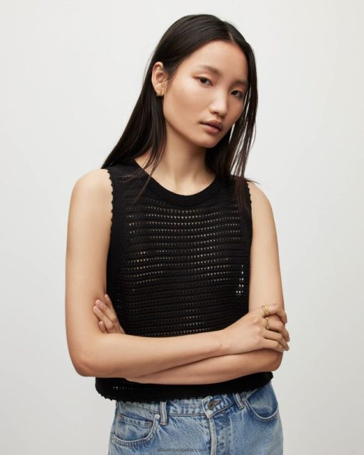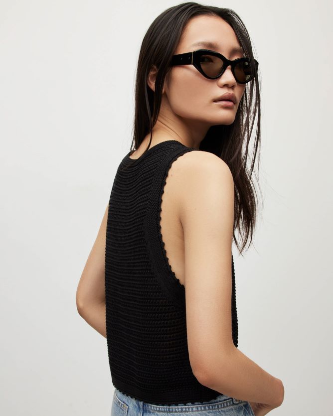 un momento de ganchillo. este es el tanque de malla. recortada y sin mangas: eche un vistazo más de cerca al trabajo de puntadas decorativas. combínalo con el cárdigan a juego, es un conjunto para el verano.