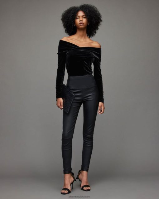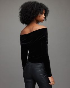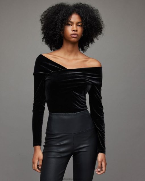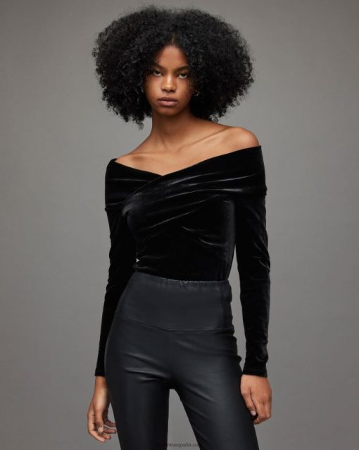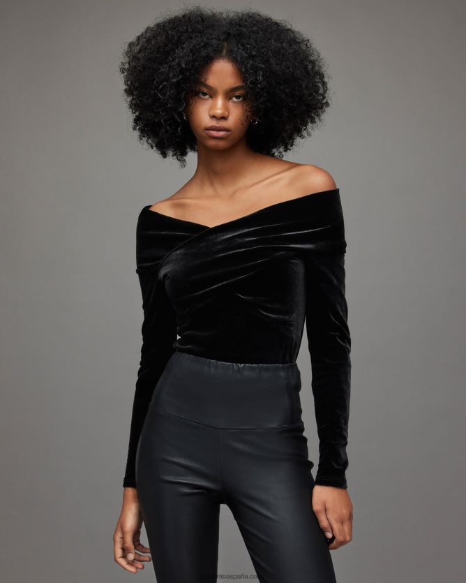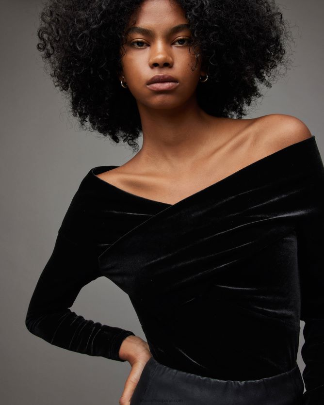 muestra algunos hombros en la parte superior de terciopelo delta. está hecho con materiales reciclados en una suave fabricación de terciopelo. se envuelve y tiene la forma de un ajuste delgado.