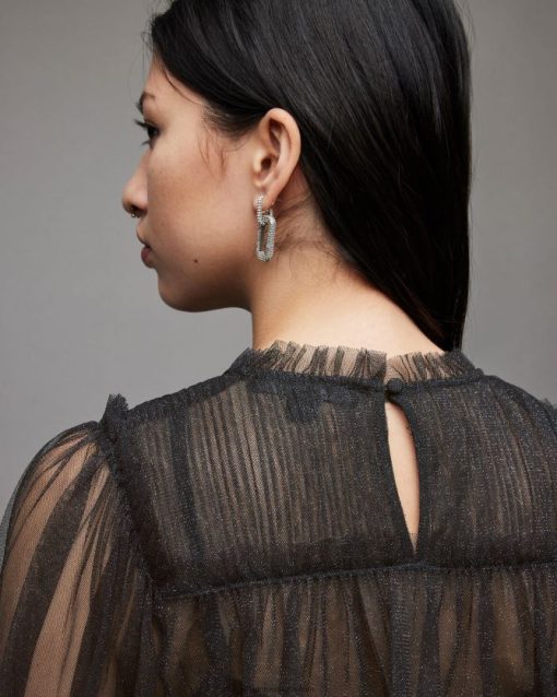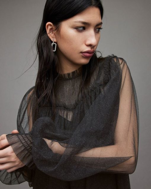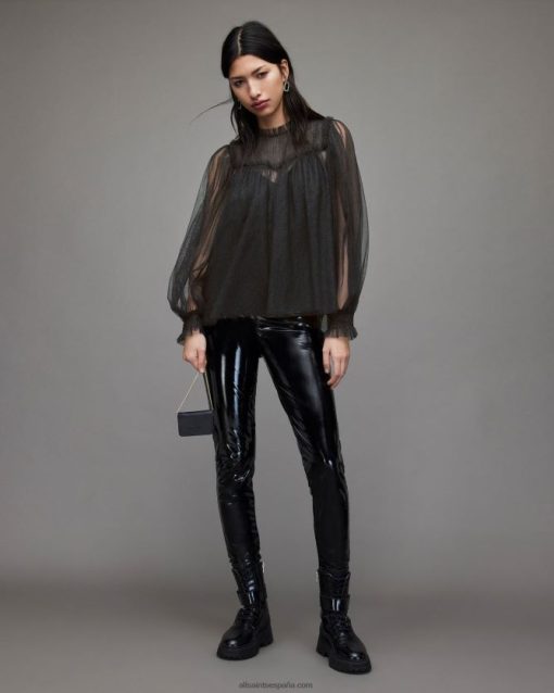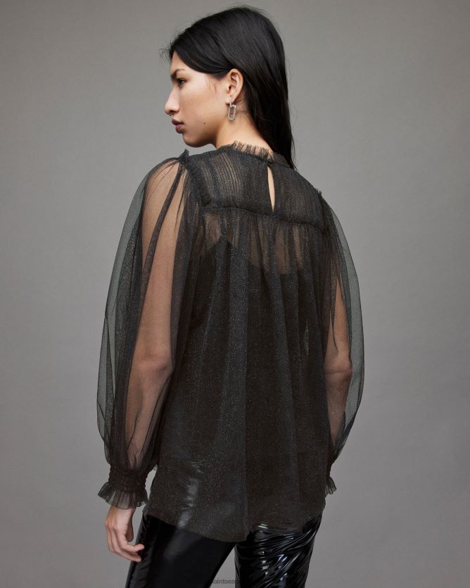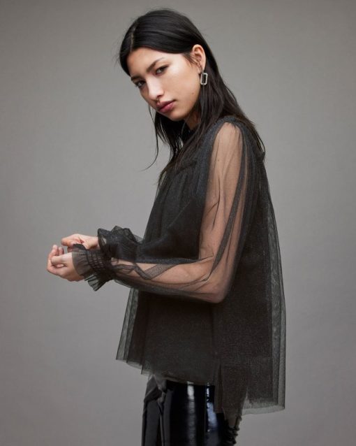 el único tul que necesitas: presenta el top perri. cuello alto y mangas blusón. fruncido y volantes para mayor detalle. hay un ligero brillo corriendo a través de la tela. forrado para mayor comodidad: cumple todos los requisitos.