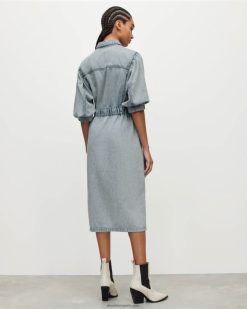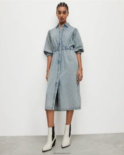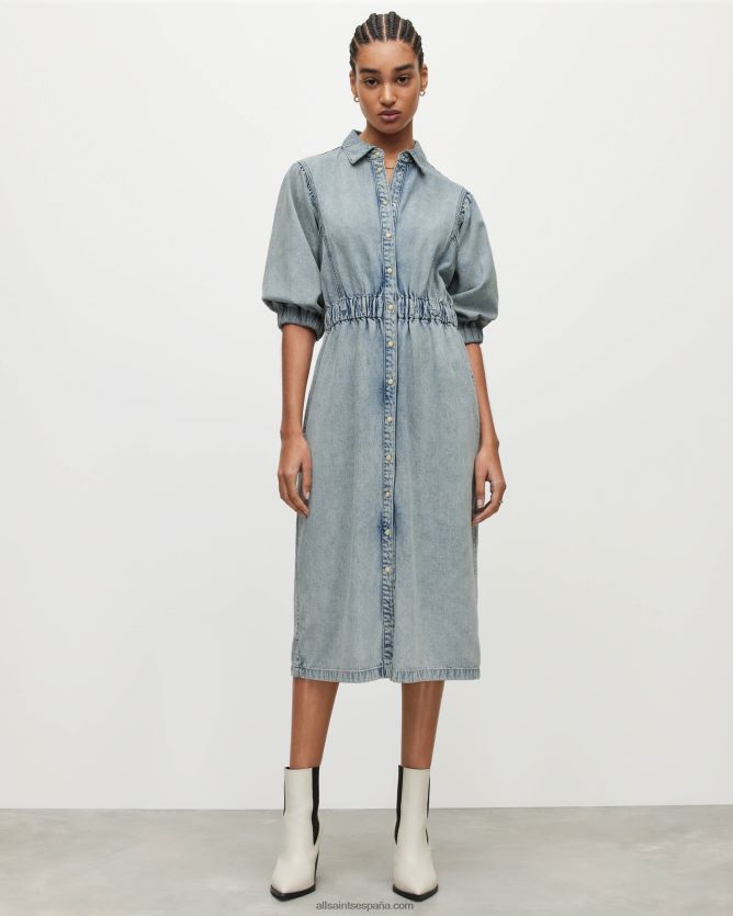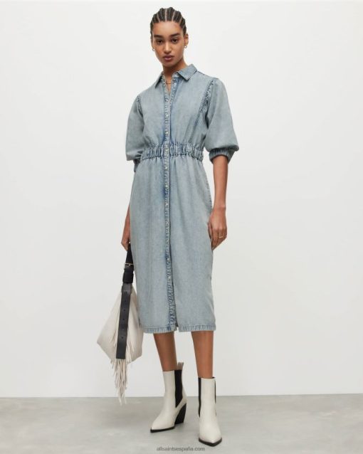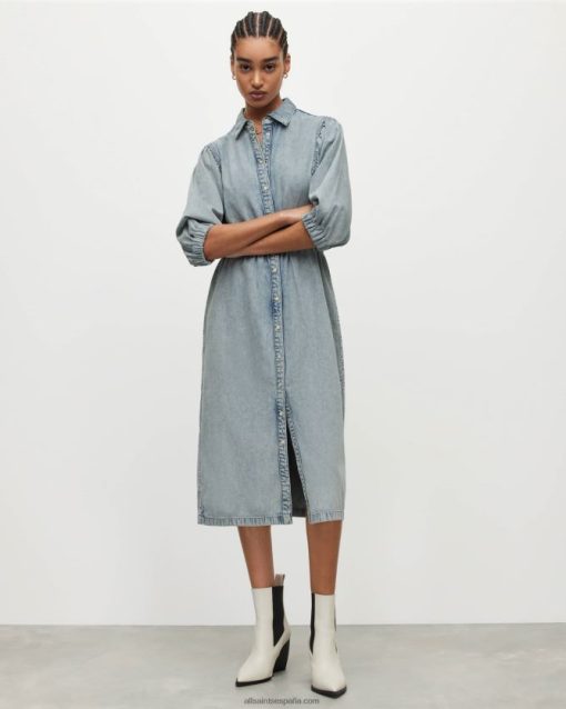 la mezclilla lavada es un ganador. el osa está confeccionado en algodón, en una silueta de vestido camisero de largo medio con cintura elástica. completado con un lavado índigo claro, es un favorito de la temporada.
